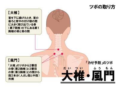 鍼灸治療としては下記の「大椎」「風門」というツボに熱く感じるまでお灸をしたり、